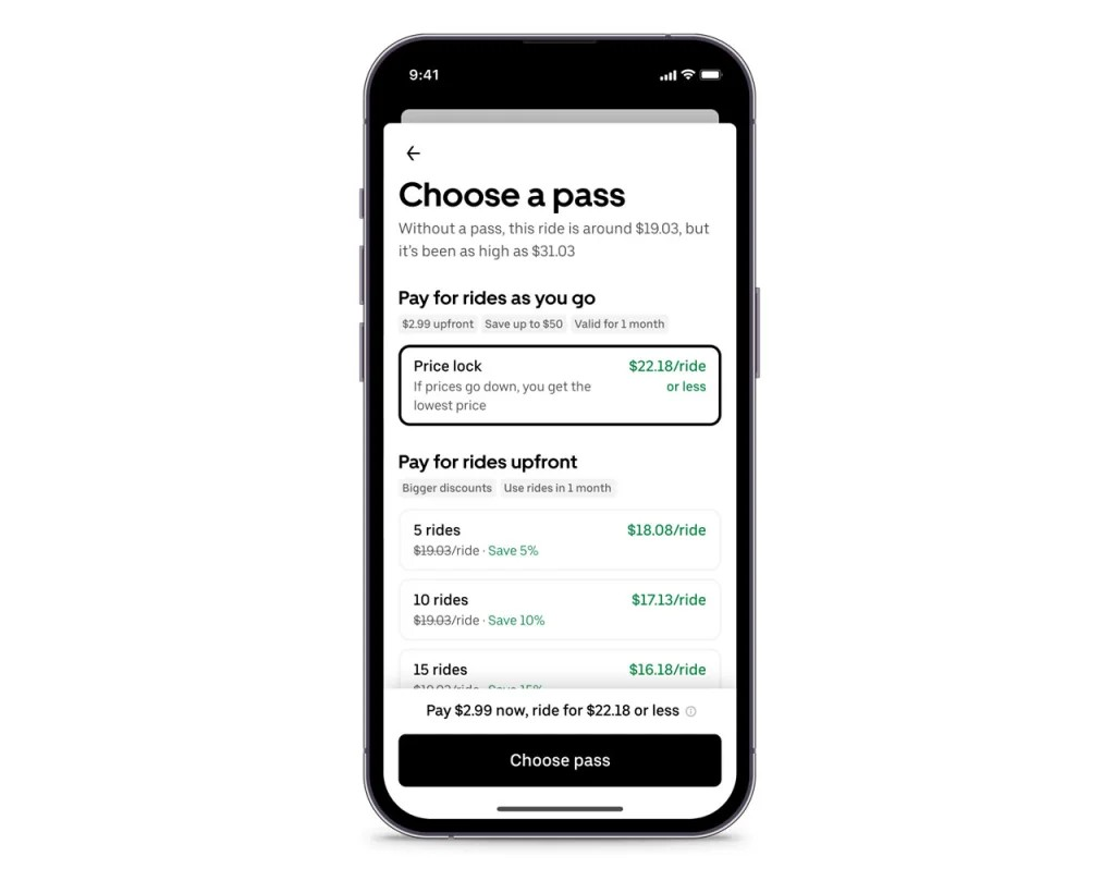 Uber ยังออก Price Lock Pass จ่ายค่าสมาชิก 2.99 ดอลลาร์ต่อเดือน เพื่อล็อคราคาของบางเส้นทาง ไม่ให้ขึ้นราคาในสภาพอากาศไม่ดีหรือการจราจรติดขัด และ Prepaid Pass เหมาจ่ายล่วงหน้าเพื่อให้ราคาถูกลง.